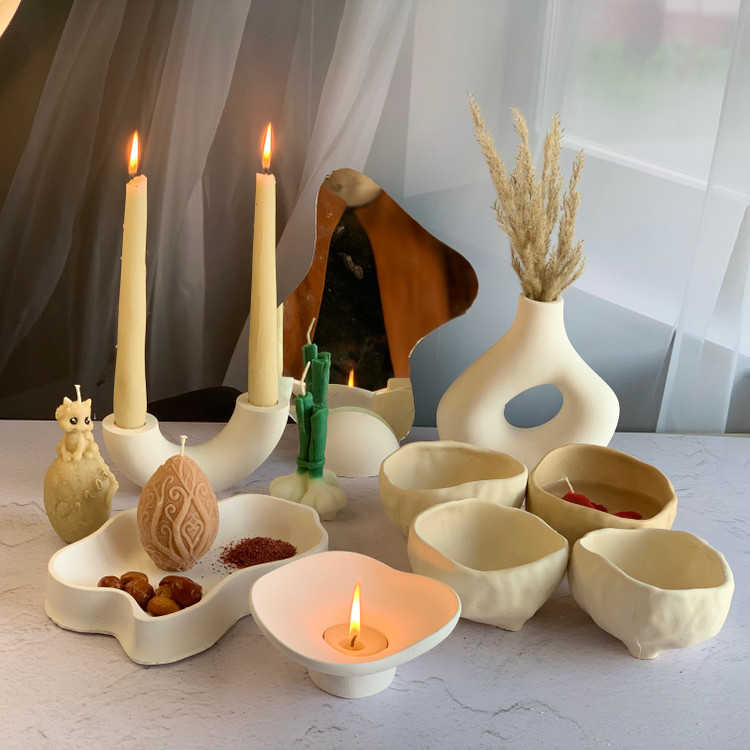 جنس پودر سنگ و قابل شستشو ظرف دفرمه بزرگ 15 سانت ، 4 عدد ظرف دفرمه قطر 11 سانت با شمعدان و استند آینه و گلدان