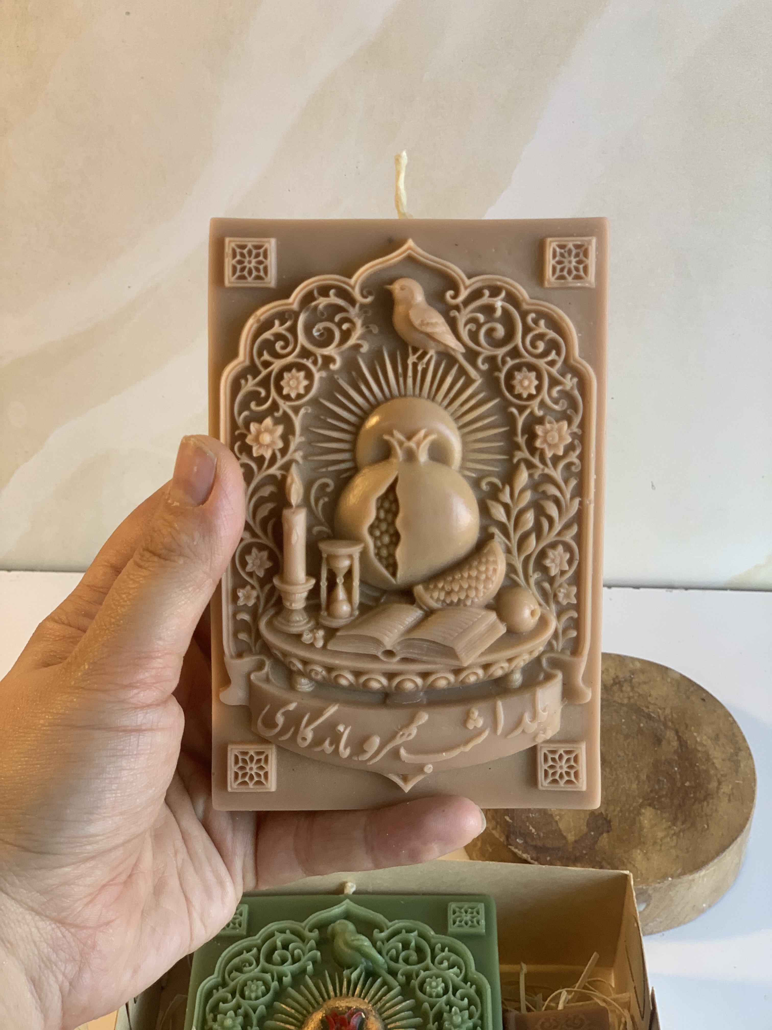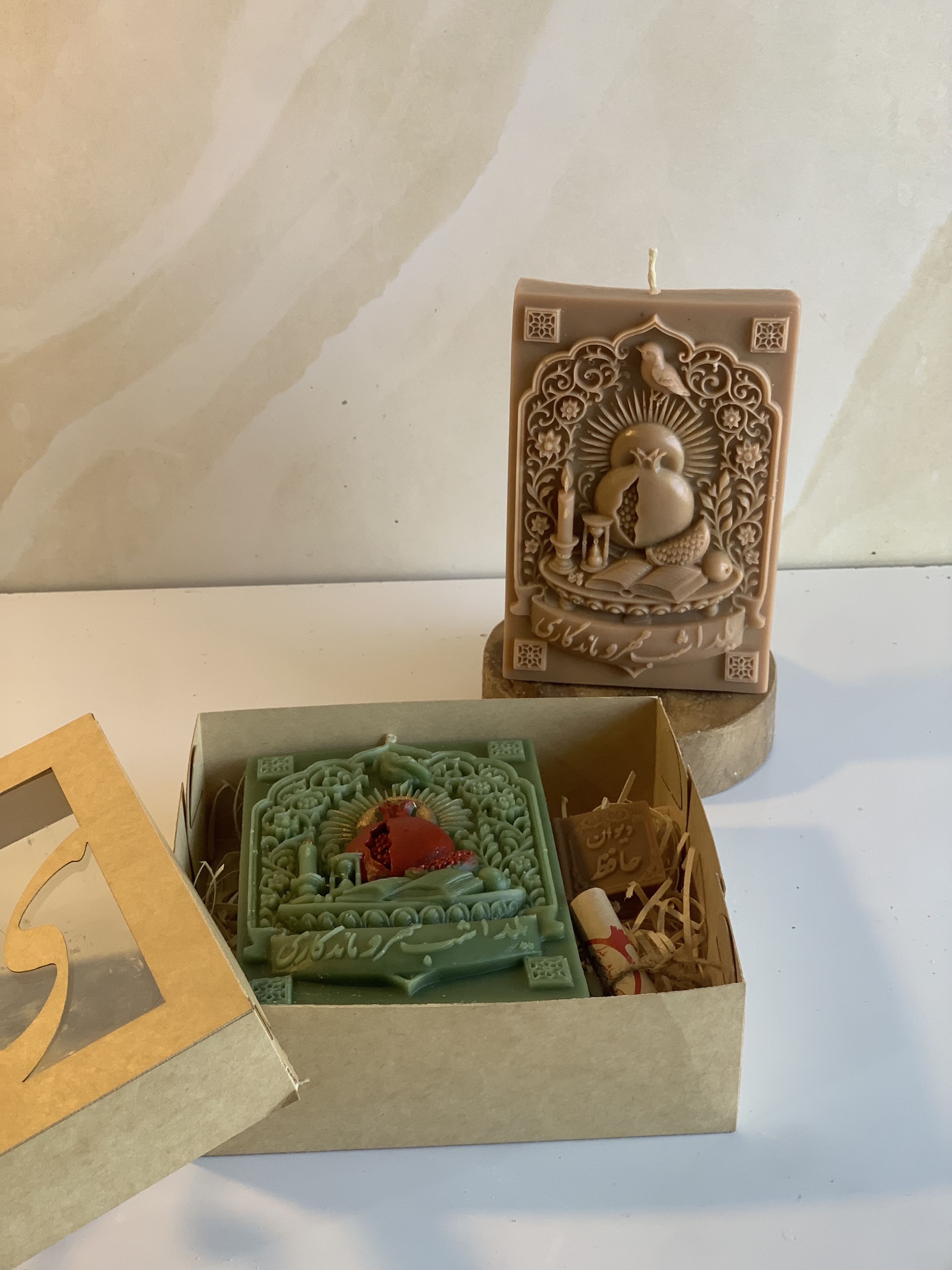 جنس پارافین مرغوب با ساعت سوخت بالا، ابعاد باکس 15 در 15 با نوشته زیبای یلدا مبارک ، روی کتیبه هم نوشته دارد
