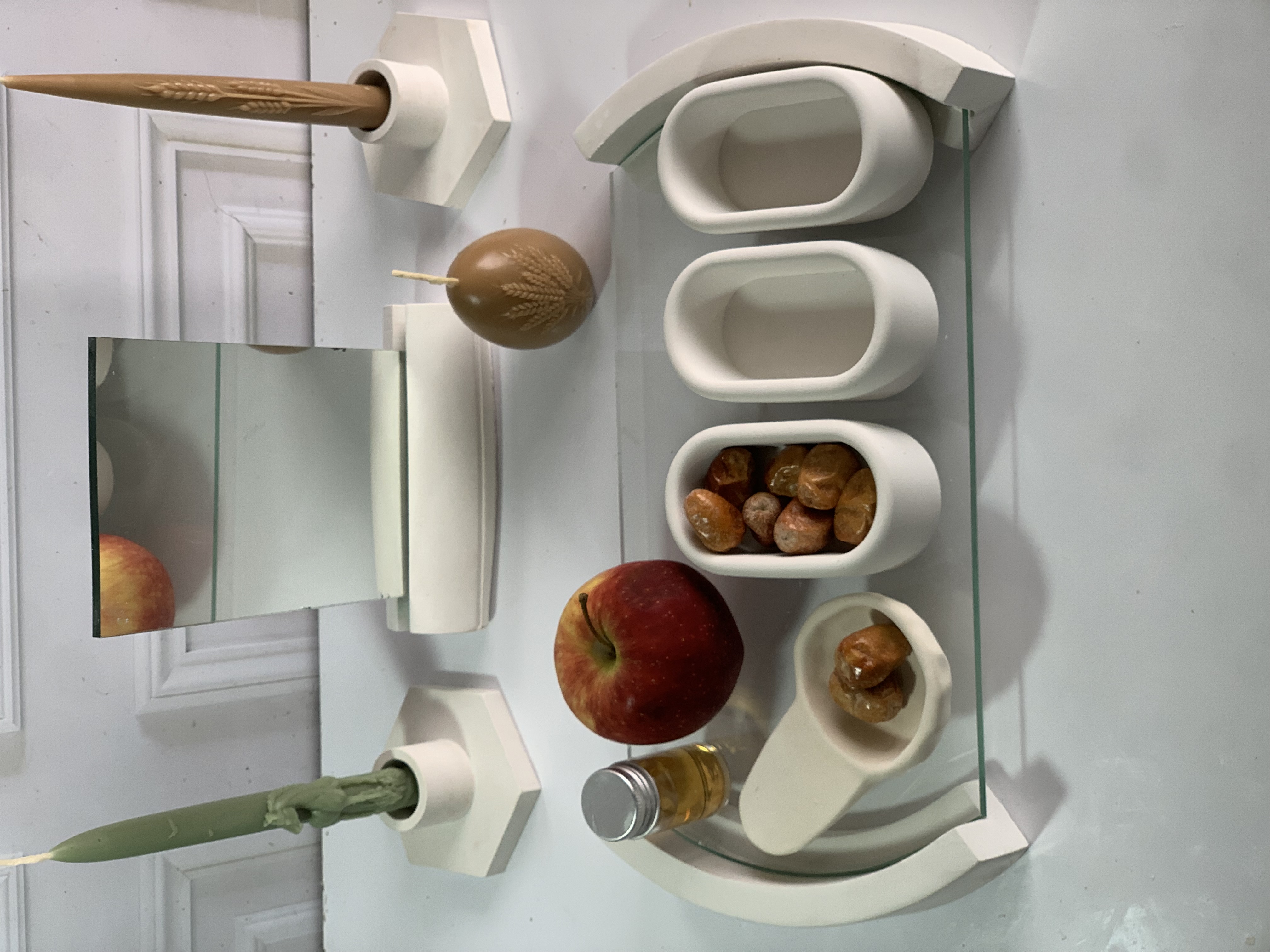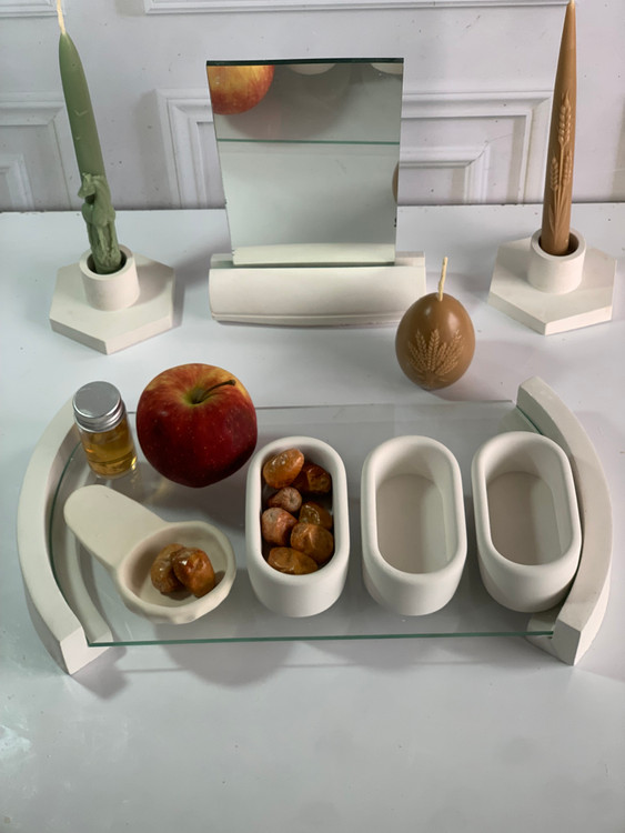 طول سینی 30 سانت ، جنس ظرفها سنگی ، هفت سین کامل با آینه ارسال می شود